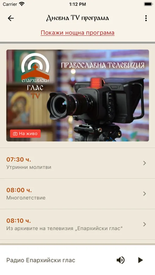 На 24 декември 2023 г., в чест на Рождество Христово, медията на Софийска света митрополия е допълнена и с онлайн телевизия „Епархийски глас ТВ“. Богатата ѝ видеопродукция включва богослужения на живо и от архива, молитви, беседи, концерти, проповеди и официални обръщения, както и няколко предавания за православно богословие и култура. Програмата, предаванията и живото излъчване на „Епархийски глас ТВ“ също можете можете да проследите в настоящото приложение.