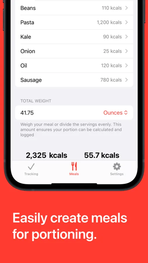 - Meals: Tracking a snack is easy enough, but what about your favorite recipe? Add the ingredients up, divide it by weight or servings, and then log your portions.