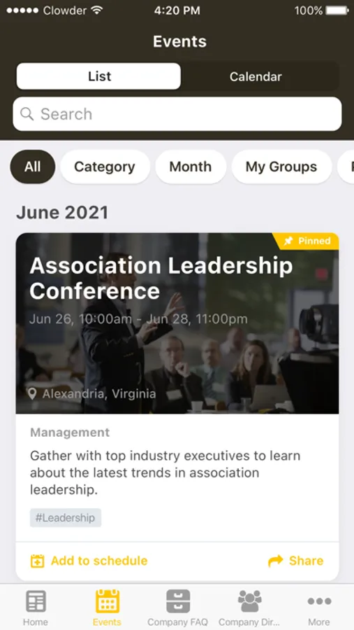 •Events Tab: Find a list of upcoming events, registration, and schedules.