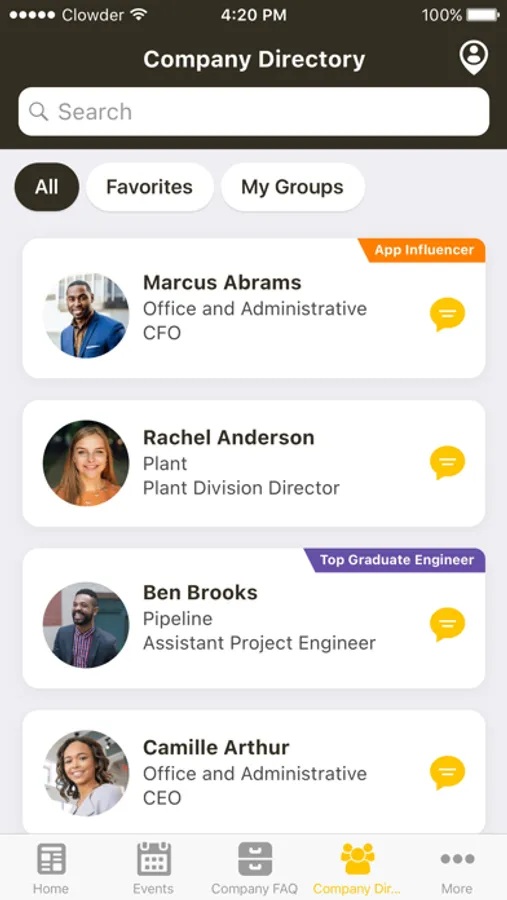 •Directory Tab: Search a list of Ruby-Collins contact information.