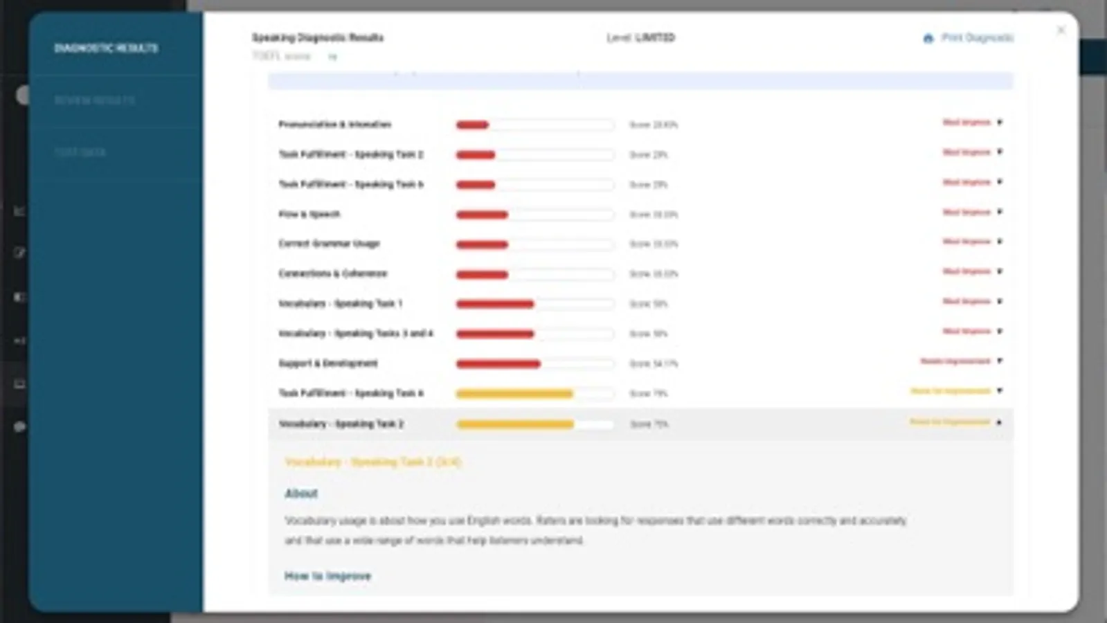3) Based on the DIAGNOSTIC RESULTS, use our TOEFL LESSONS to learn the needed tips and strategies and use TEST/STUDY Mode section to hone your skills.