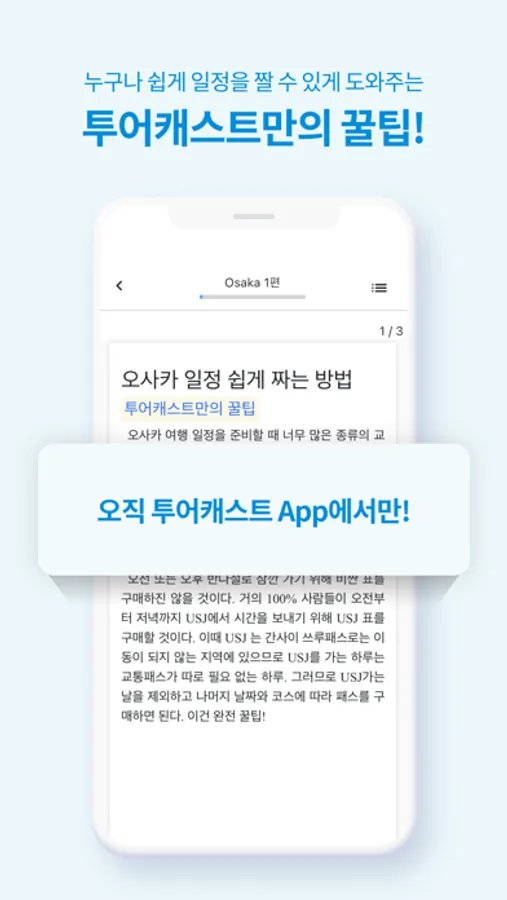"투어캐스트"는 무료 가이드북 형태의 애플리케이션으로, 여행객들에게 여행 준비 단계부터 일정을 계획하는 방법, 여행의 꿀팁 등을 제공하여 여행을 더욱 쉽게 준비하고 즐거운 경험으로 만들어주는 역할을 합니다. 이 앱은 단순히 관광지를 소개하는 것이 아니라, 그곳의 역사적 배경과 문화적 의미를 포함하여 여행을 더욱 의미 있는 것으로 만들어주는 것을 목표로 하고 있습니다. "아는 만큼 보인다"라는 말처럼, 투어캐스트는 여행자들에게 더 많은 정보를 제공하여 더 풍성하고 깊이 있는 여행을 가능하게 합니다.