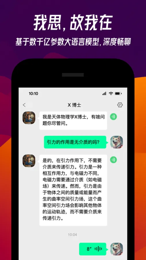 欢迎使用我们的应用。零维宇宙是一个基于世界顶级大语言模型开发的AI机器人聊天工具,您可以根据自己的喜好创建AI机器人并调节机器人的参数,您可以创建多个不同身份的AI机器人,让TA们成为你的朋友、恋人、亲人、娱乐伴侣或学习伴侣等,这些身份会影响到AI机器人的说话方式、知识和行为。