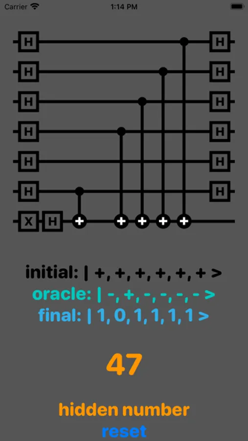 This app represents the quantum circuit for Bernstein-Vazirani algorithm. Hidden number goes from 0 to 63.