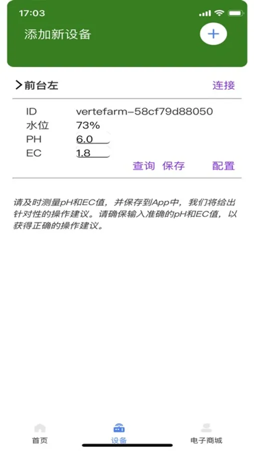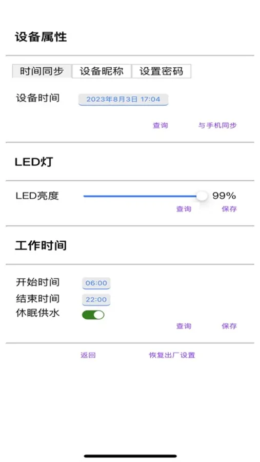 APP通过蓝牙与采绿种植机通信,可查询、配置设备的传感器状态信息、LED亮度、水泵开关时间。可配置设备的昵称、同步设备时间、设置登录设备密码。