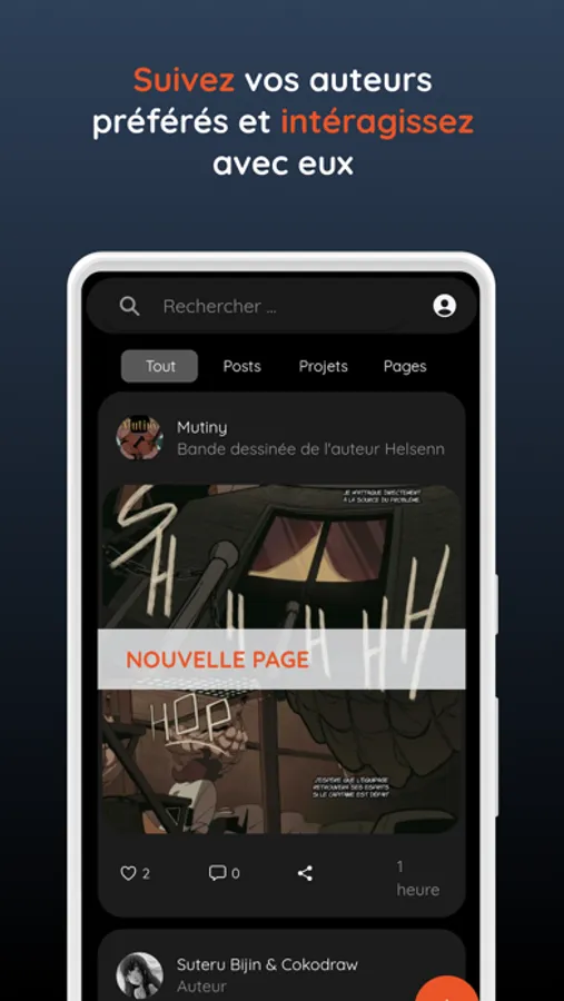 - Un suivi des auteurs et des manga afin de rester informé de leurs dernières nouveautés. Celles-ci apparaissent dans un fil d'actualité à la manière d'un mur insta où le lecteur peut interagir directement, que ce soit pour commenter, aimer ou partager chaque manga et publication.
