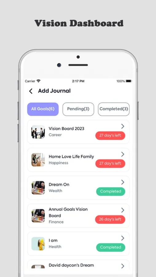 Dashboard goal tracking will help users to quickly identify their progress of Vision strengths and weaknesses with all of their lifetime goals.