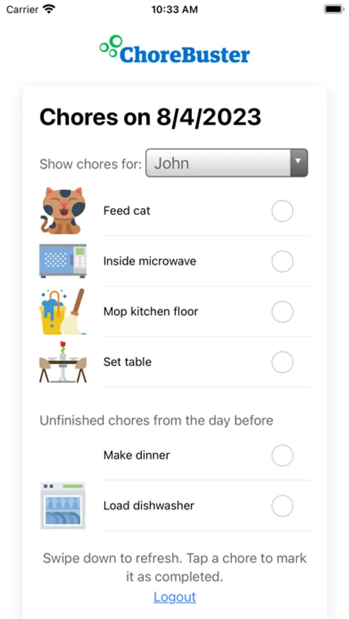 This is the companion app to ChoreBuster.net which automatically generates a fair schedule of chores for everyone in the household. Use the website to set everything up and then use this app each day to see which chores you've been assigned and mark them as completed as you go.