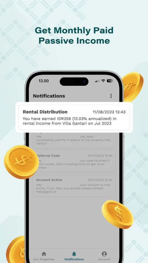 GORO is a marketplace for fractional property ownership where you can buy the best properties in Bali & Jakarta starting from $1 and earn up to 10% per year in monthly paid income. Just as on a conventional online marketplace, simply browse GORO’s property catalog and buy whichever you want instantly — anytime, anywhere you like, directly on the app!
