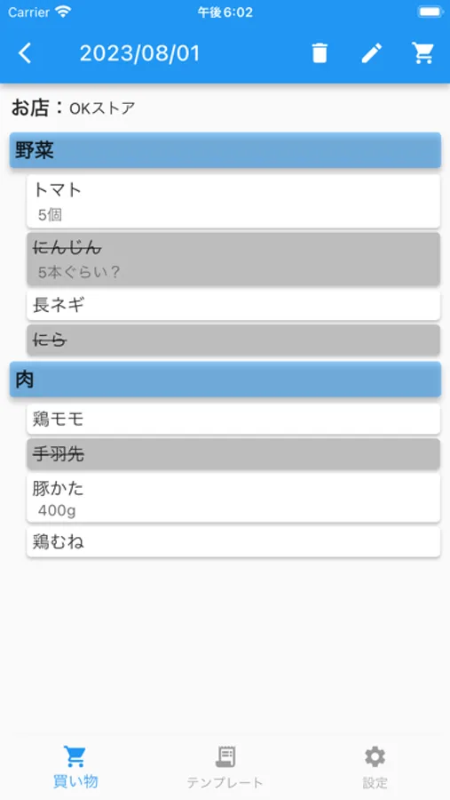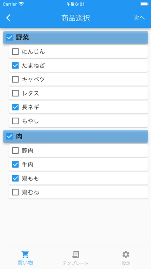 ・テンプレート機能があるので、買いたいものだけチェックして簡単に買い物リストが作れる!