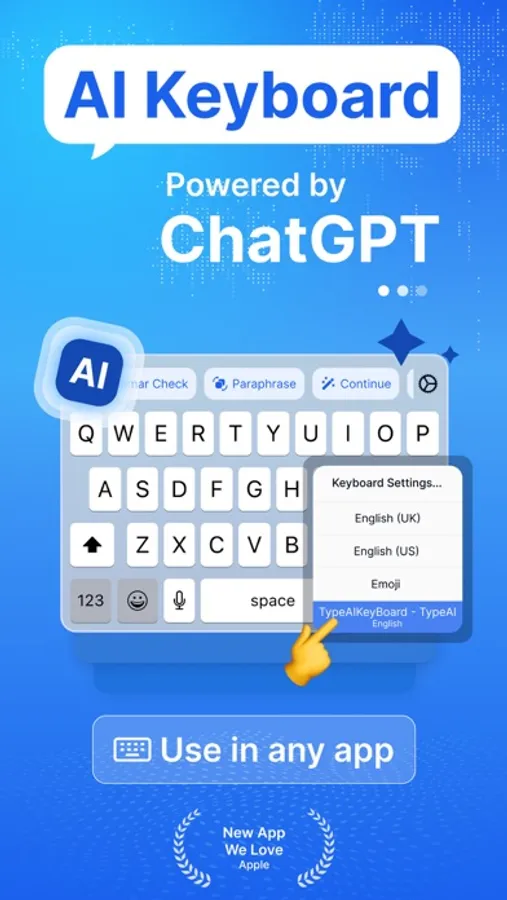 AI Keyboard makes it easier for ai writing, get answer from ai, ai assistant & personal assisstant, grammar check, paragragraph writer, quick reply, versify, emojify and conversation translator.