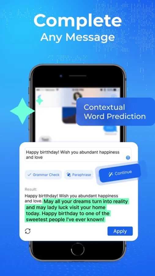 Continue: AI Keyboard can continue your texts based on the context you provide, making writing much faster and complete your messages.