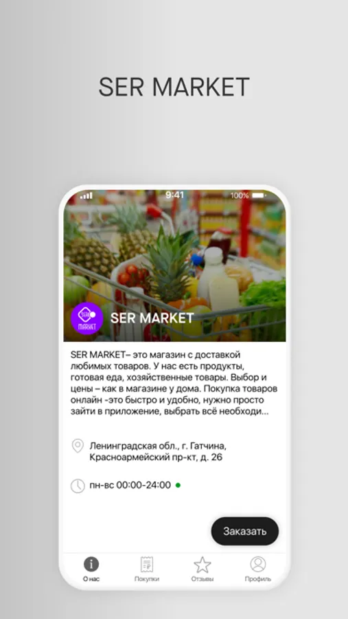 SER MARKET — это магазин с доставкой любимых товаров. У нас есть продукты, готовая еда, хозяйственные товары. Выбор и цены — как в магазине у дома. Покупка товаров онлайн — это быстро и удобно, нужно просто зайти в приложение, выбрать всё необходимое и совершить заказ.