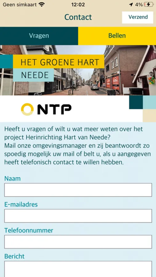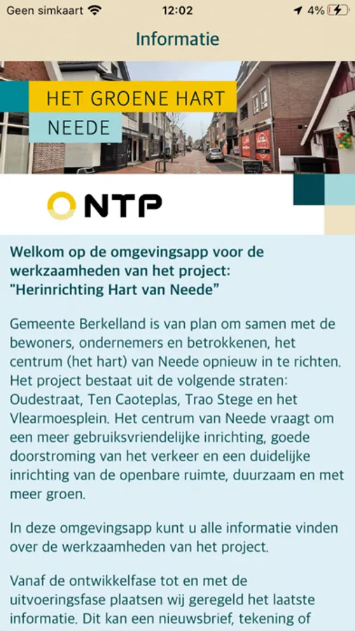 In deze app vindt u alle informatie over de werkzaamheden van het project Het Groene Hart Neede. Er wordt belangrijke projectinformatie, de laatste planning en contactinformatie weergegeven. Ook kunt u op deze app vragen, opmerkingen of klachten achterlaten die betrekking hebben op het project.