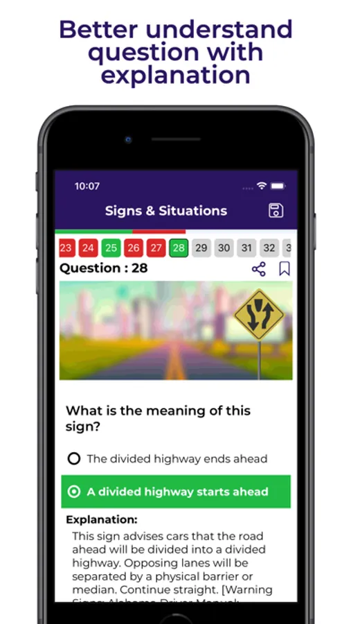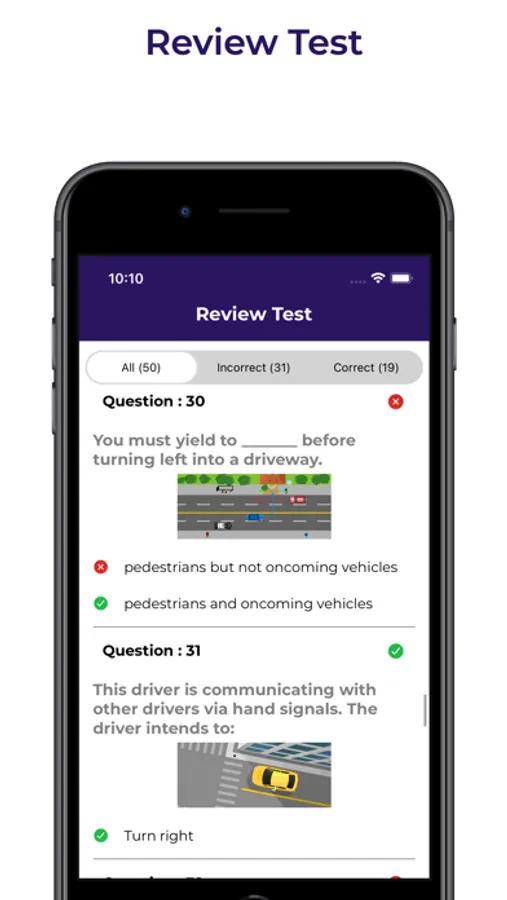 The app includes a Mock Test with random questions and a Practice Test with a variety of DMV Permit Test practice questions. These questions are based on the Department of Motor Vehicles handbook from different states .