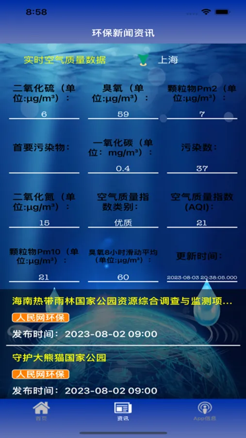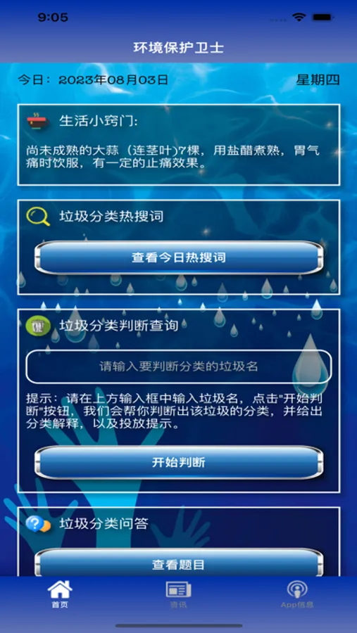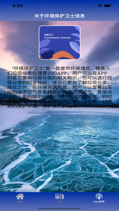 ”环境保护卫士“是一款宣传环保理念,提高人们垃圾分类处理意识的APP。用户可以在APP的首页查询垃圾分类的相关知识,也可以进行垃圾分类的问答挑战。使自己更加了解垃圾分类。除此之外,在环保资讯页面,用户可以查看到实时的城市空气质量数据,如要切换城市,直接点击右上角的城市的图标,就可以切换城市。同时还有环保的资讯新闻供用户查看。让大家一起更好的保护环境,保护我们的地球。