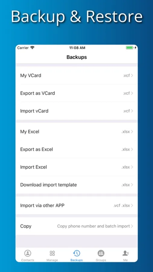 Option to export contacts as Excel or VCard files for easy backup or transfer.
