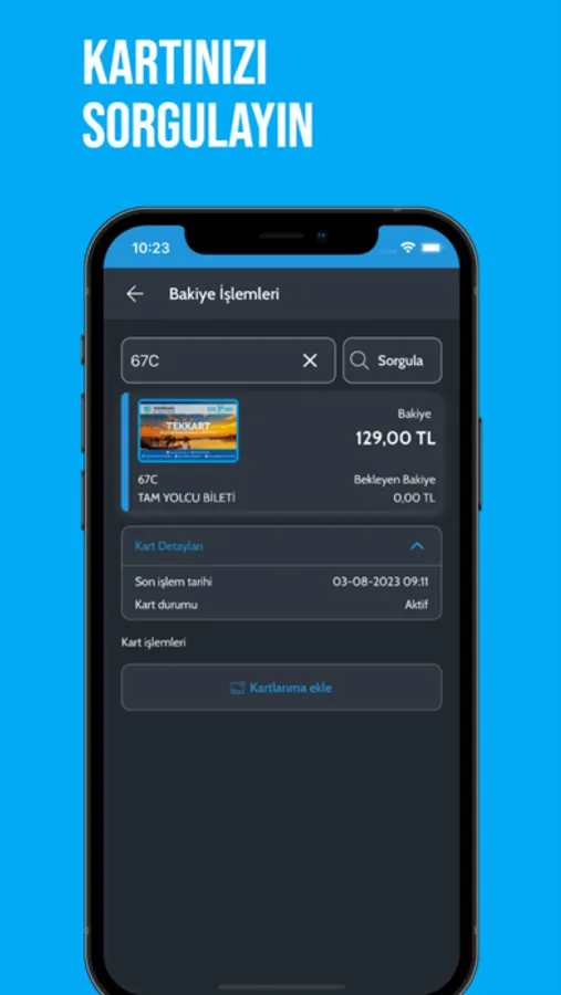Uygulama Fonksiyonları : Otobüsüm Nerede, Bakiye Sorgulama, Bakiye Kontrol, Ücret Tarifesi, Hat Hareket Saatleri, Yetkili Bayi ve Kart Merkezleri, Bakiye Yükleme, İletişim, Favoriler, Şikayetim Var