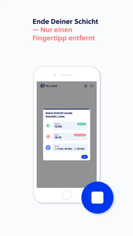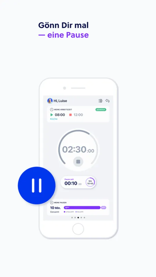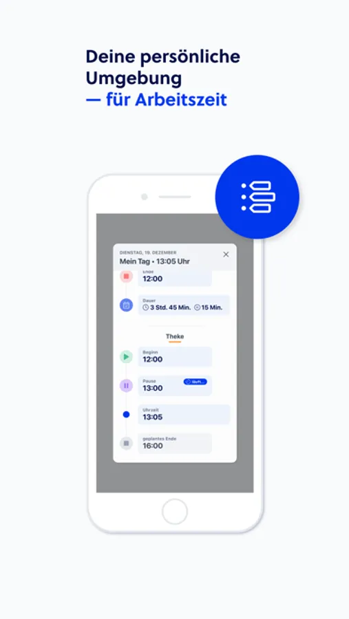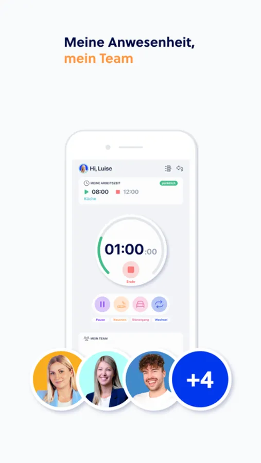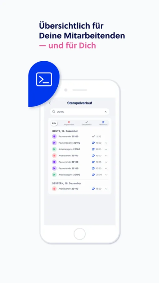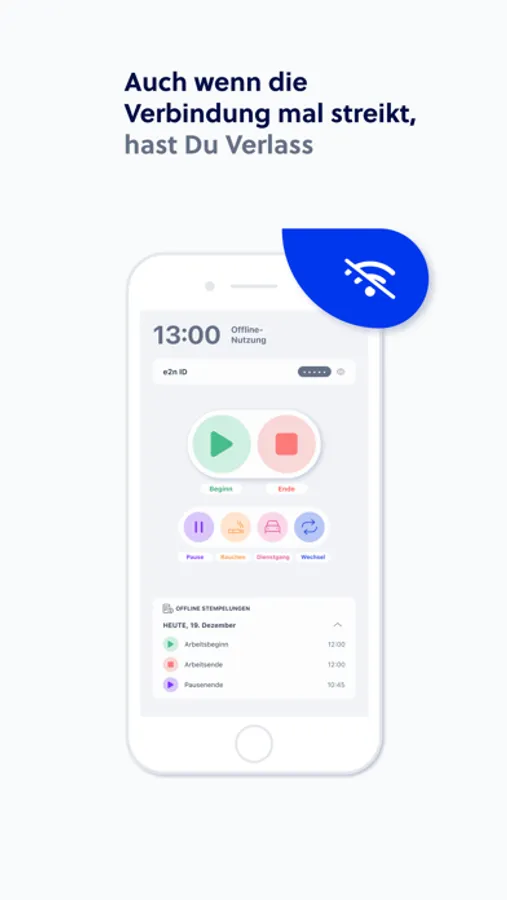 Verwandle Dein iPad in eine digitale Stempeluhr. In der e2n terminal App können Mitarbeitende ihre Zeiten erfassen und sehen allerlei Informationen: