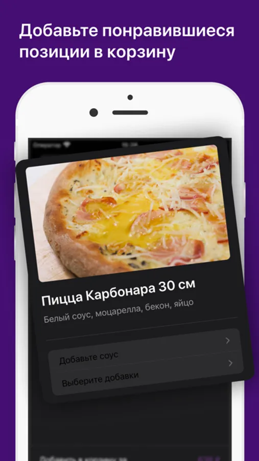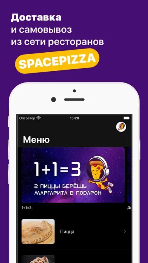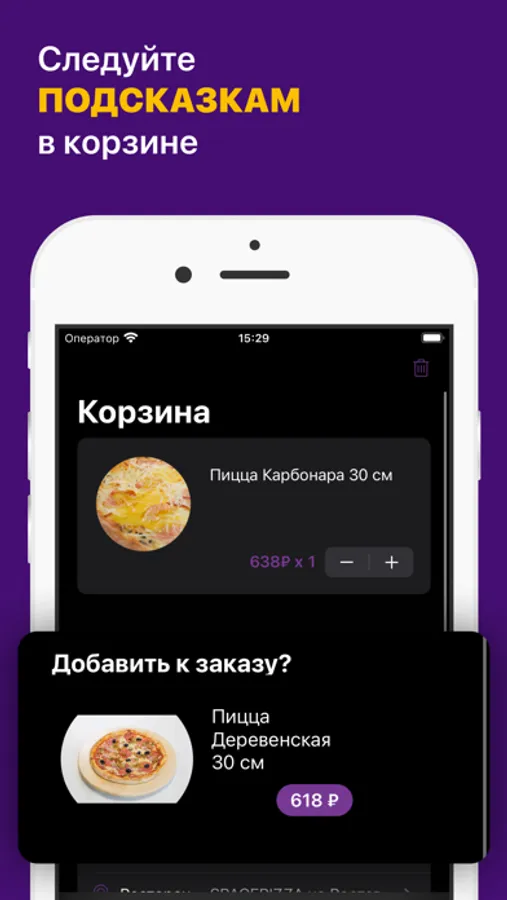Как сделать заказ в приложении “SPACEPIZZA”: выберите понравившиеся позиции из меню, добавьте их в корзину и перейдите на экран оформления заказа (по нажатию на иконку корзины).