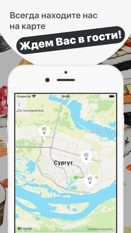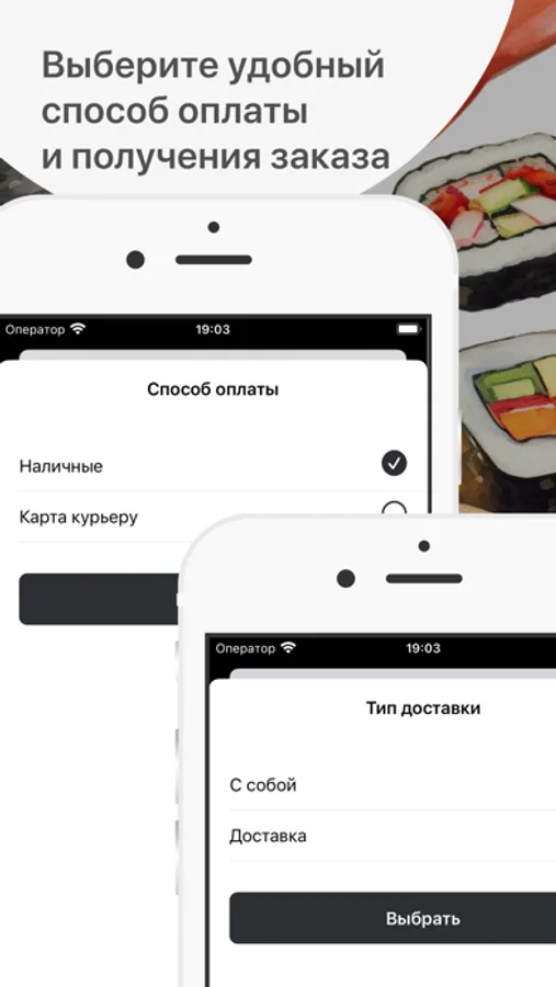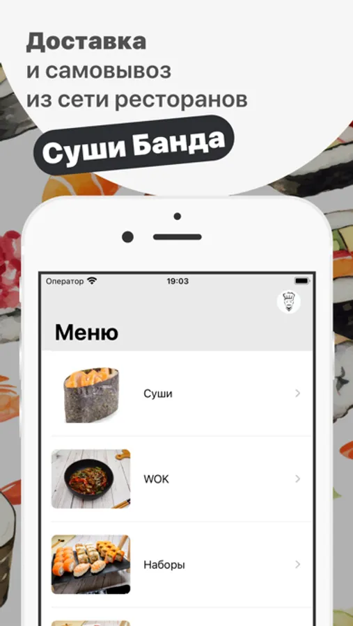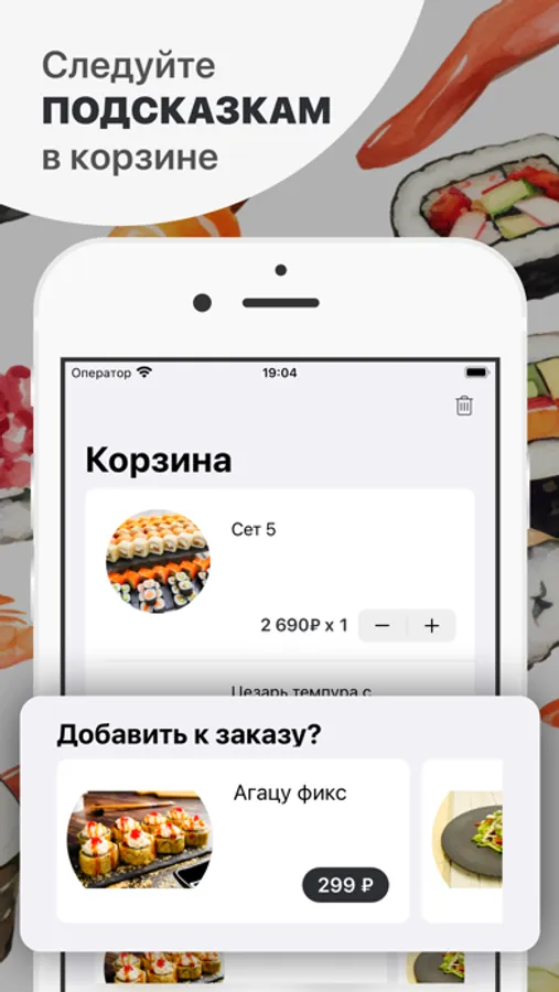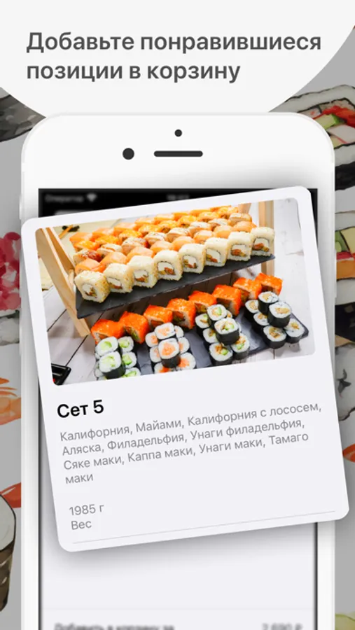 Как сделать заказ в приложении “Суши-Банда”: выберите понравившиеся позиции из меню, добавьте их в корзину и перейдите на экран оформления заказа (по нажатию на иконку корзины).