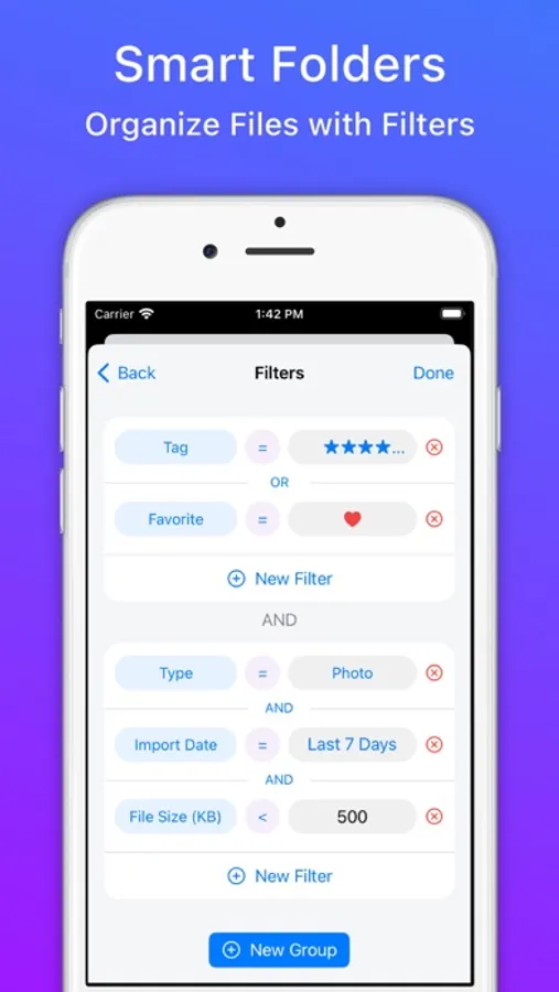 • Organize & find your files easily with Smart Folders. You can filter and view items by name, tags, type, date, size, favorite property and more.