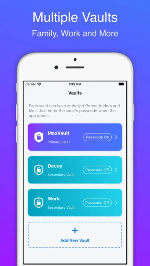 • Create multiple vaults to store entirely different files and folders (decoy, home, work etc) by entering different passcodes