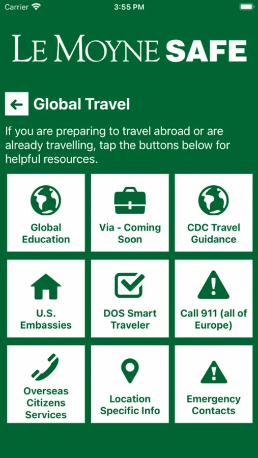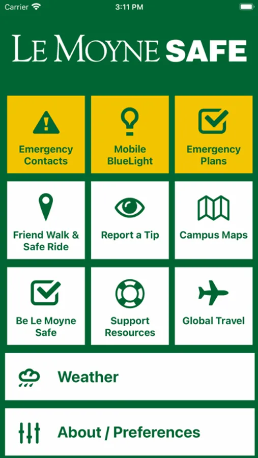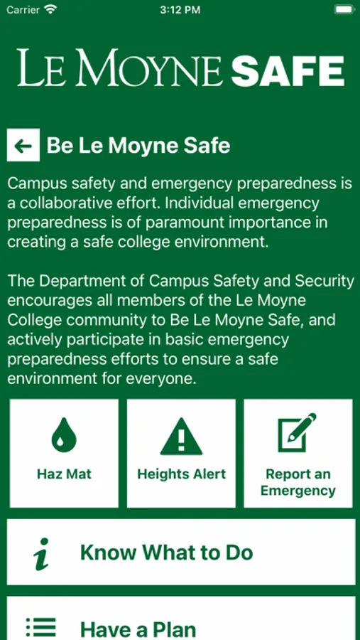 Le Moyne Safe is the official safety app of Le Moyne College. It is the only app that integrates with Le Moyne College's safety and security systems. Campus Safety has worked to develop a unique app that provides students, faculty and staff with added safety on the Le Moyne College campus. The app will send you important safety alerts and provide instant access to campus safety resources.