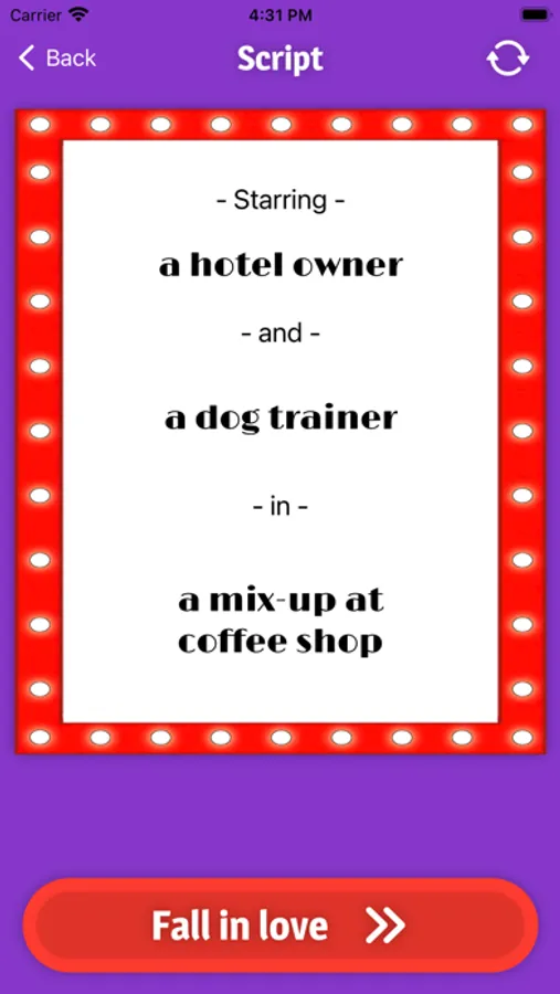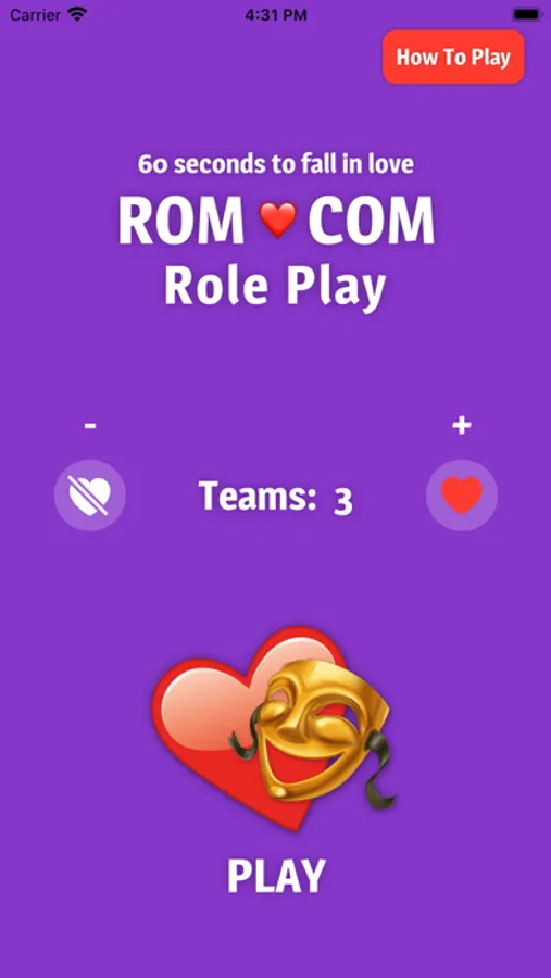 Couples split into teams and are given two roles and a setting with only 60 seconds to fall in love. The other team will rate your performance, and the couple with the most points at the end, wins!
