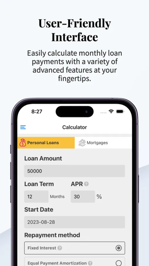 * Support 4 repayment methods, fixed interest, equal principal and interest, equal principal, interest before principal