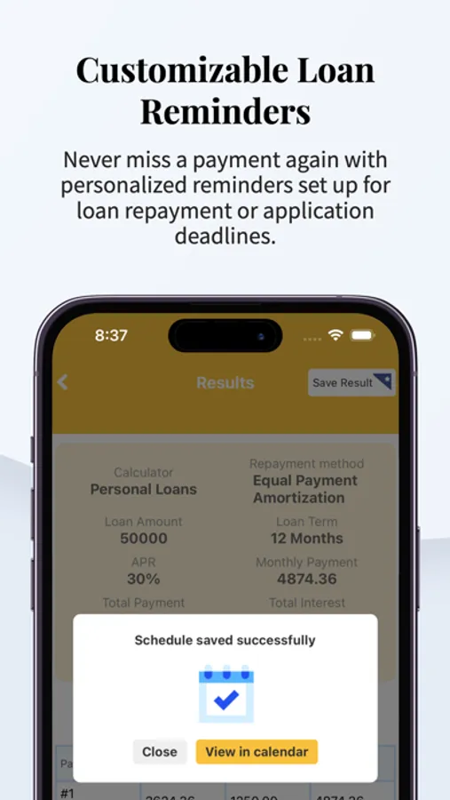 Our app also allows you to add loan repayment reminders to your calendar. This way, you'll never miss a payment and can stay on top of your finances. Additionally, you can set up reminders for loan application deadlines or target repayment dates, so that you can stay on track to meet your financial goals.