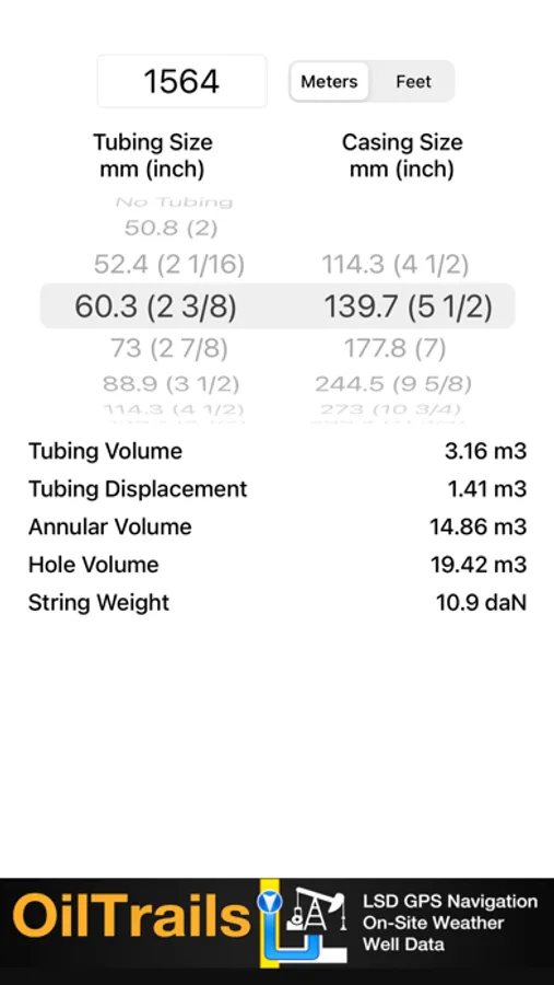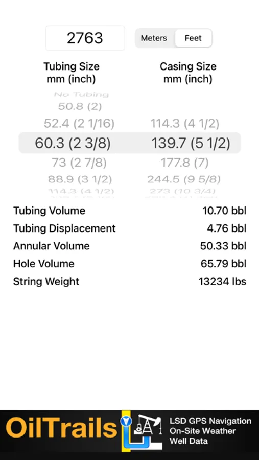 -Easily figure out hole volumes by putting in the hole depth and selecting the pipe and casing size.
