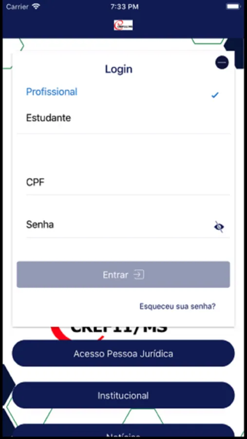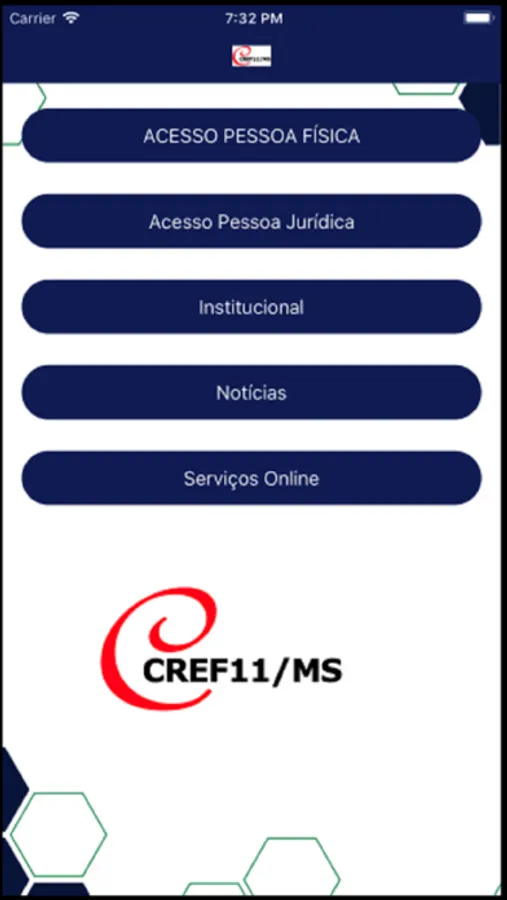 Aplicativo do CREF11/MS contendo notícias do conselho, a possibilidade de consultar e alterar dados cadastrais e realizar pagamento das anuidades do conselho.