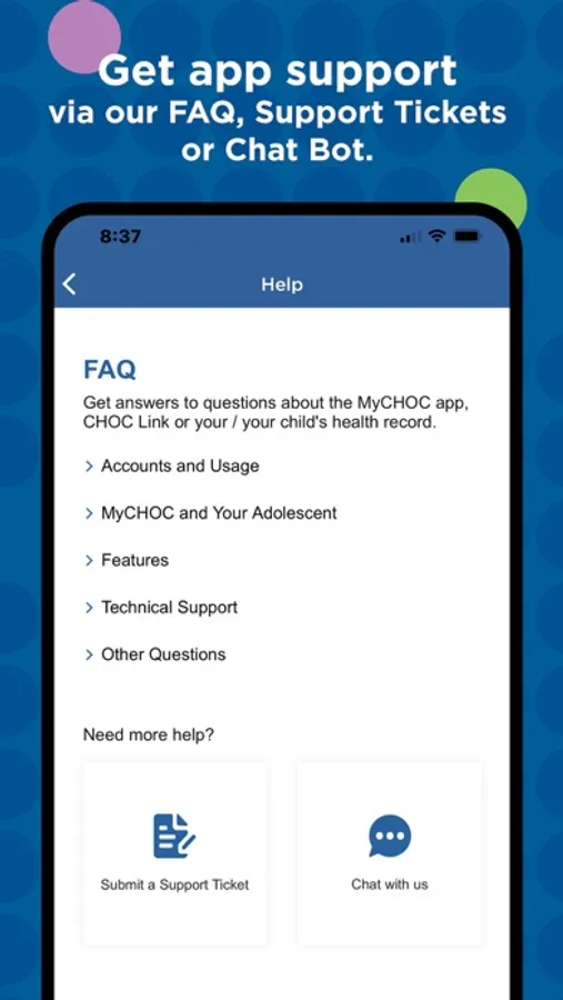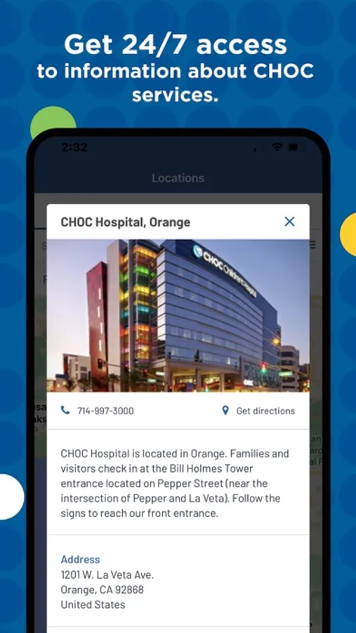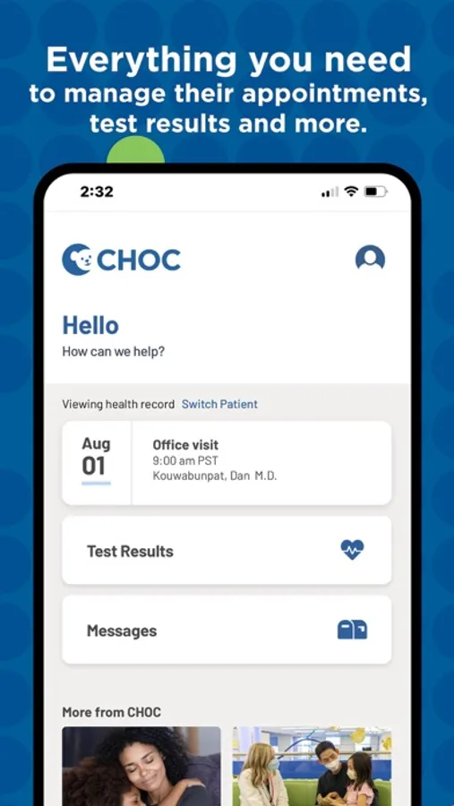Manage your child's health information securely and conveniently with the MyCHOC app. Explore content designed to help keep your kids safe and healthy from the pediatric experts at Children's Hospital of Orange County. Communicate with your care team, track appointments, get reminders and much more.