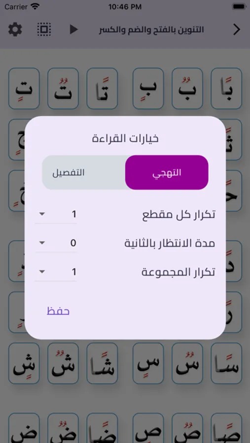 - خيارات القراءة (التفصيل - التهجي - الوصل والوقف).