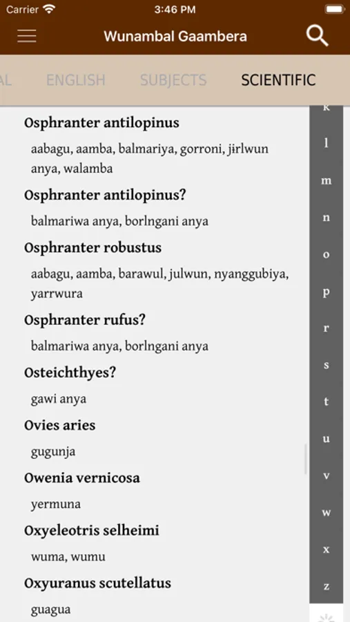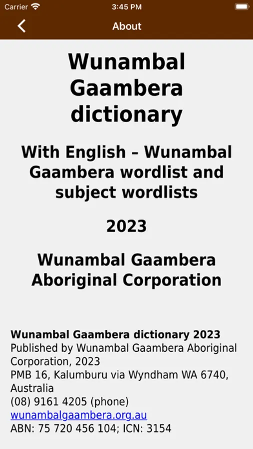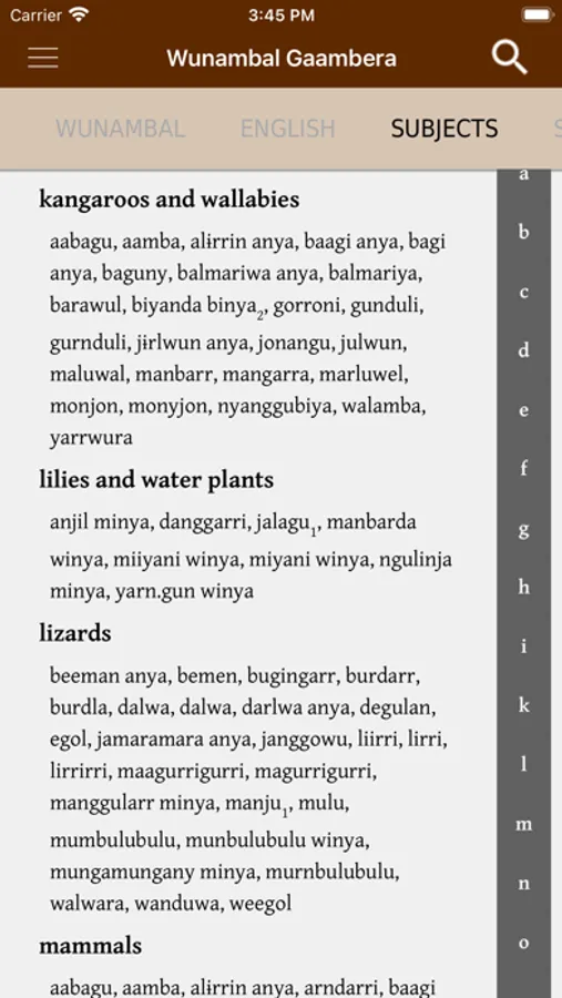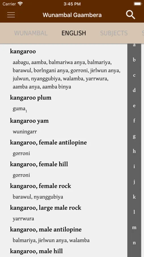 This Wunambal Gaambera to English dictionary features sound and pictures; an English to Wunambal Gaambera wordlist; English subject wordlists; and an index of scientific names.