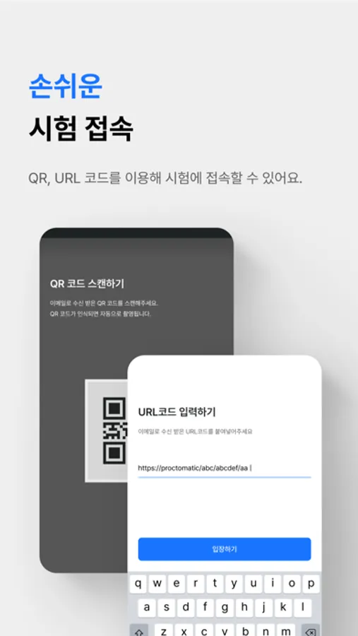1. 주최자 측으로부터 전달 받은 QR 혹은 URL 코드로 시험에 접속합니다.