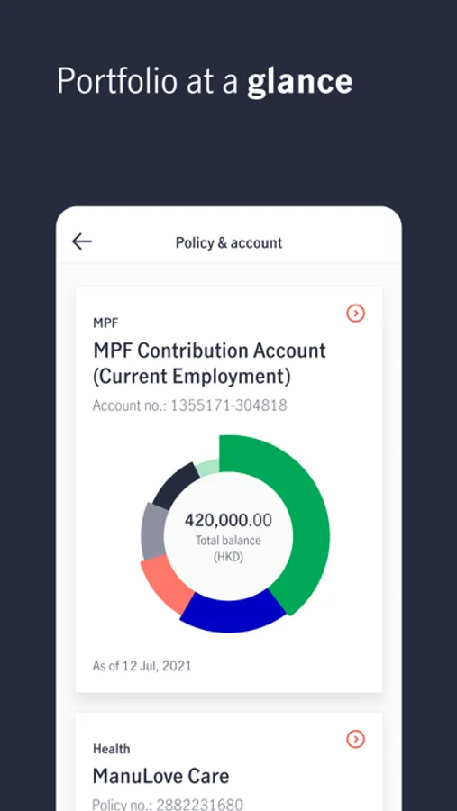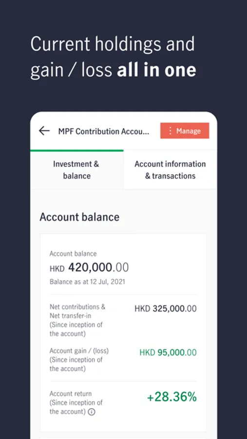 • Review MPF / Pension / Investment Funds account details (including current holdings and gain / loss)