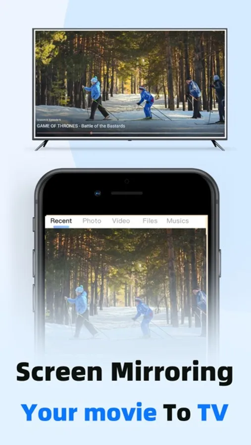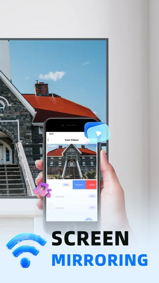 The screen mirroring can play music, videos, photos and file resources in the app to play on the big screen.