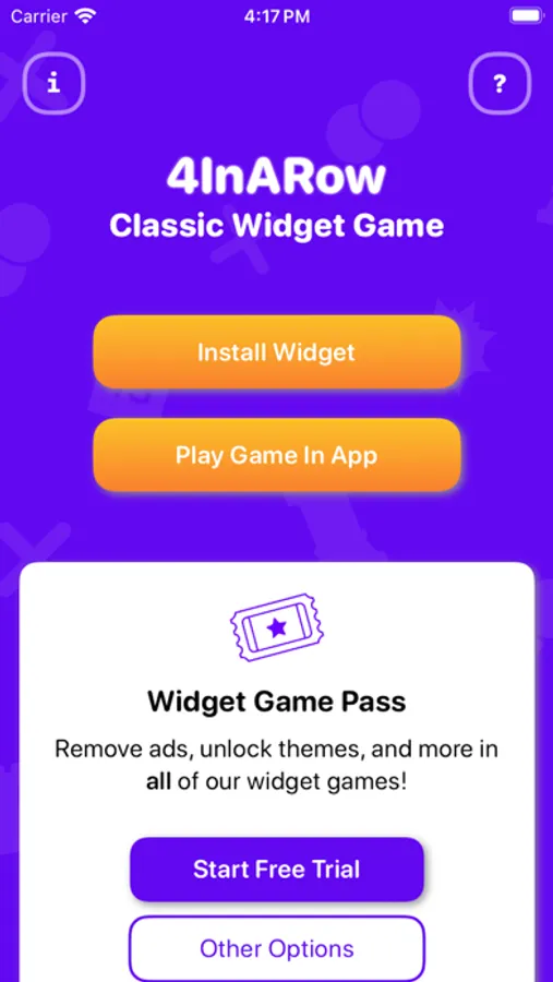 "4 In a Row Classic Widget Game" is part of our collection of Classic Widget Games you can play right on your iOS Home Screen or Mac desktop. Download all 6 today! Get the Classic Widget Game Pass to unlock themes and disable ads in all of the games for one low price or opt to unlock just the games you want separately.