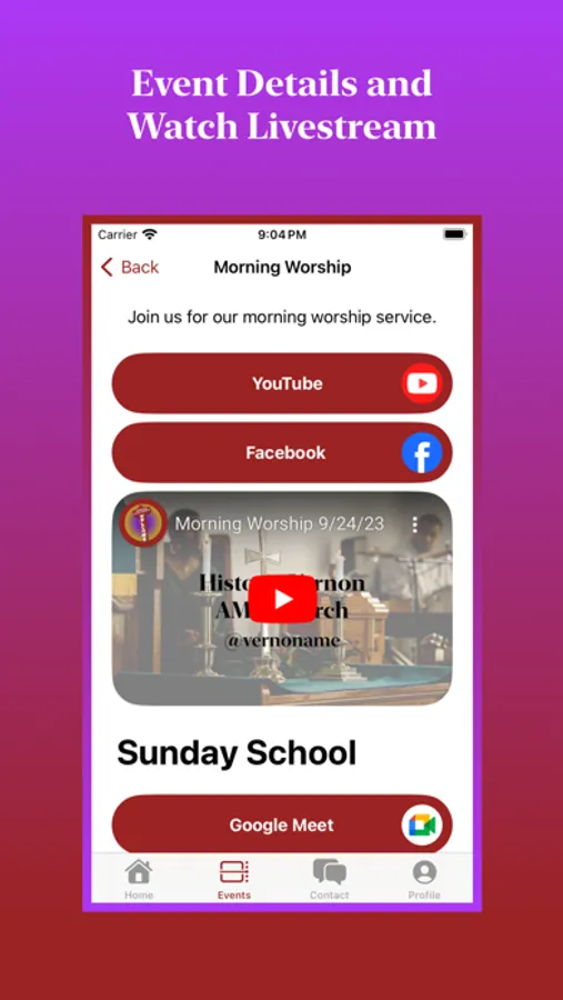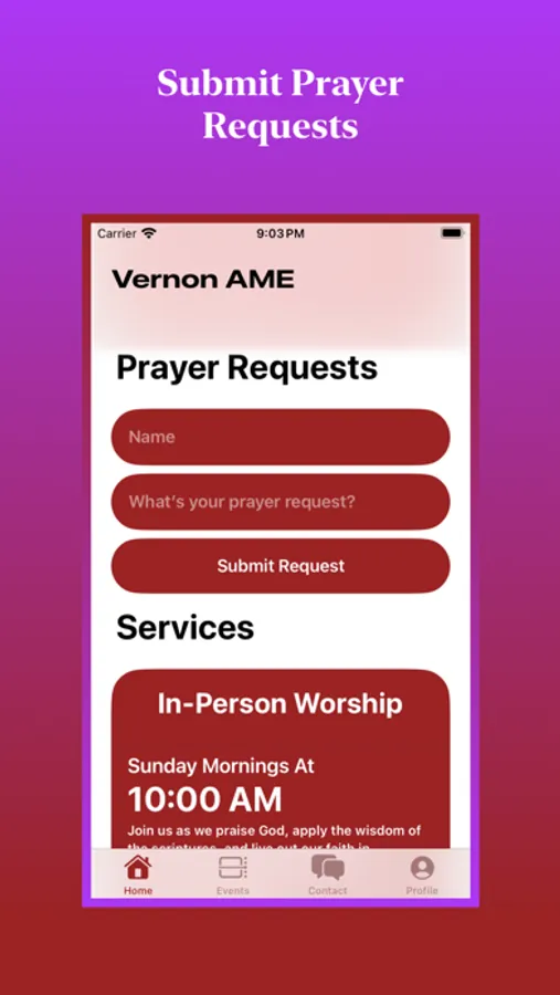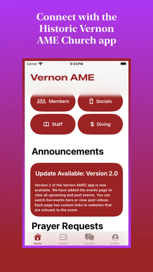 Meet the Historic Vernon AME Church mobile app. Our app let's you connect with the church through weekly live streams. You can view announcements, submit prayer requests, and contact us through the app.