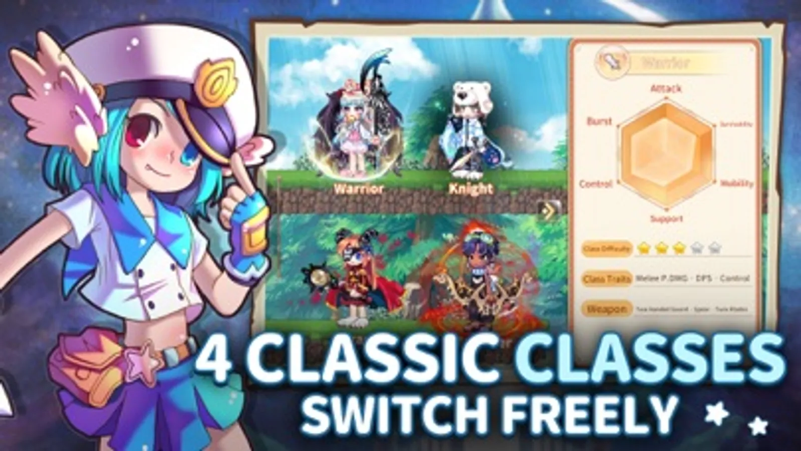 Remember the good old days? We've brought back the four iconic classes you know and love – Warrior, Explorer, Knight, and Wizard, each with 2~3 different kind of weapons to match. Now team up to challenge the classic Bosses!
