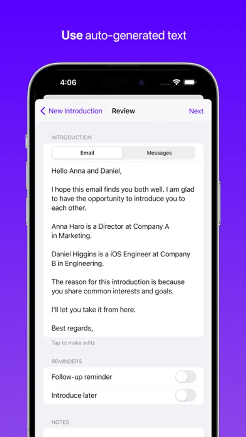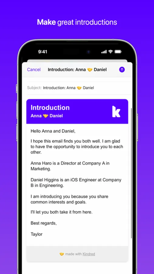 Enter Kindred. We've transformed this complex task into a seamless process. With just a few clicks, our innovative platform expertly crafts and formats personalized introductions for you, enabling you to introduce your contacts with ease, confidence, and professionalism. All it takes is a selection of the contacts you wish to connect, and voila - send beautifully crafted introductions directly via email or text, right from within the app.