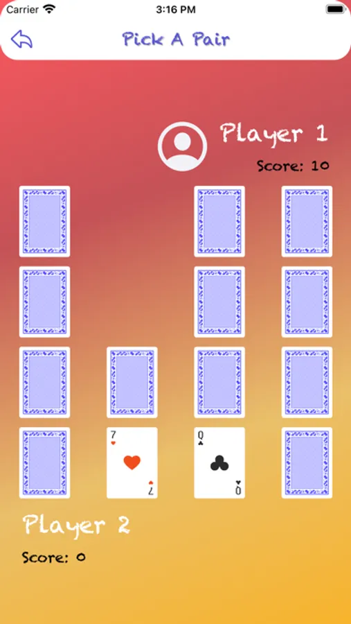 Shuffle the deck of cards and lay them face-down in a grid.", "On their turn, a player flips over two cards of their choice.", "If the flipped cards match in rank, the player will get 10 points, and those card will get disappeared and other player will get turn.", "If the flipped cards don't match in rank, the player will not get any points, and those card will turned face-down and other player will get turn.", "The player with the most pairs wins.