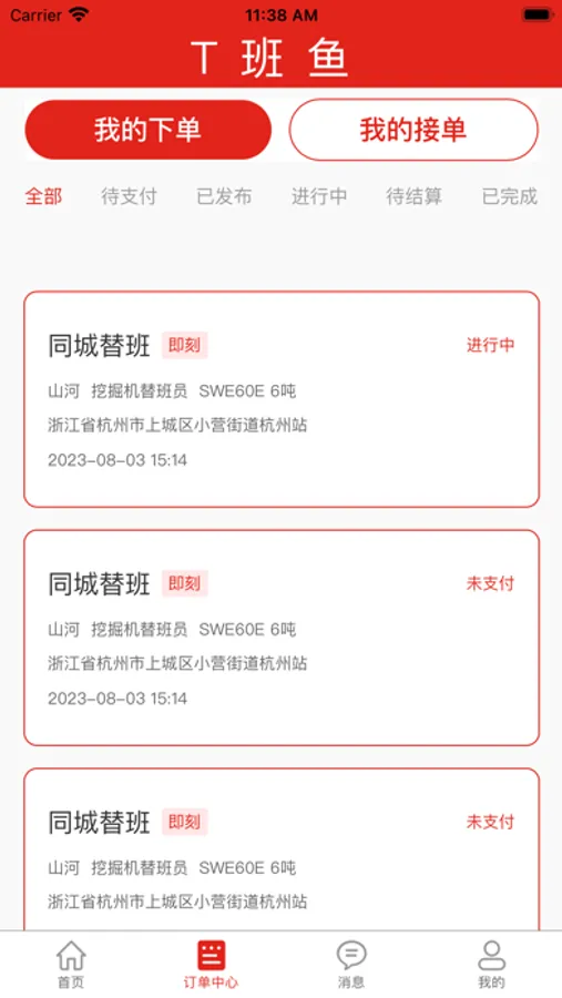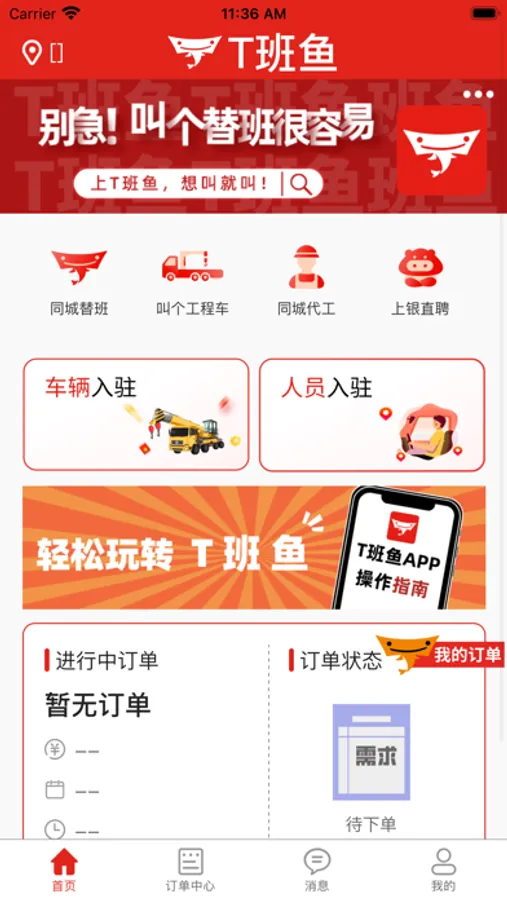 介绍——T班鱼平台运营同城替班、叫工程车、同城代工、上银直聘、钻机租借、一键报修六大主线业务,解决施工项目中长短期用工、工程车短期租借等问题,为工程管理者提供资源集中的下单平台,为工程从业者提供资源变现的接单平台。四大主线业务都包含了“我要下单”,“我要接单”两个入口,用户可以在平台选择需要的服务进行下单,若该单迟迟没人接单,用户可以进行打赏来提高接单成功率,接单完成也可以对订单进行对应的打赏和增加工作时间,入驻方可以在平台进行接单,接单之后可以与下单方联系,按照用户规定的时间完成工作任务可以赚取工资。