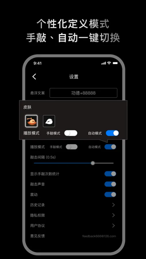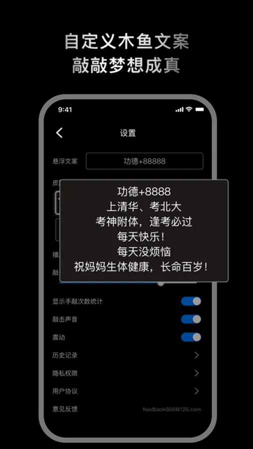 模拟真实木鱼,点击屏幕敲击木鱼;悬浮文字个性化设置,愿望敲敲成真;多种个性化播放模式、皮肤供你选择。木鱼一敲,功德+1,烦恼-1。在不急不缓的敲木鱼声中,净化心灵,消除杂念!