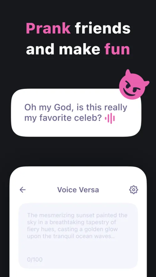 Discover the power of Voice Versa, the ultimate app for voice cloning! Whether you want to replicate your own voice with just one minute of audio or try out the voices of 100+ celebrities, Voice Versa makes it easy, fun, and incredibly lifelike.