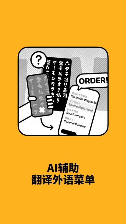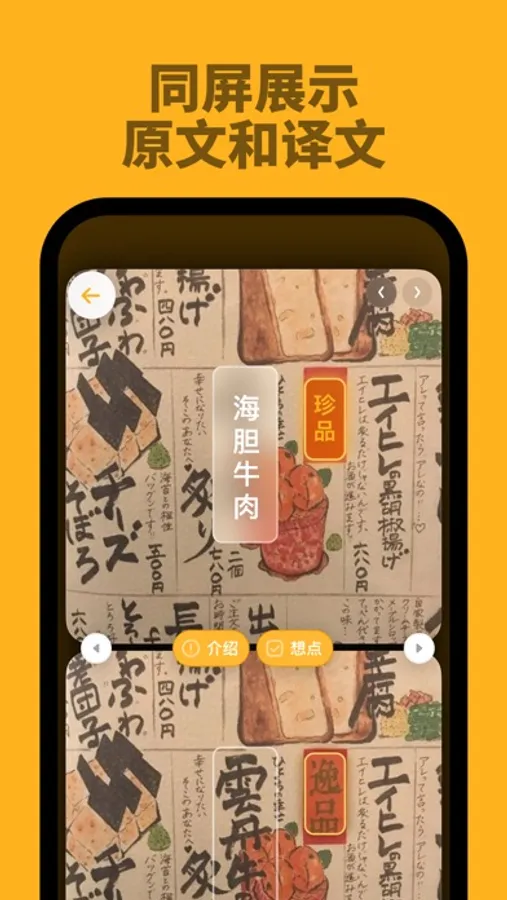 打开后拍照或选择图片即可进行翻译,支持多种语言,翻译页面左下角四个图标分别为双语对比模式、翻译模式、原图模式和文字菜单模式,点击任一框框即可使用「介绍」功能获得详细解析,加入「想点」后即可在右下角「想点」中完成点餐。欢迎反馈问题。