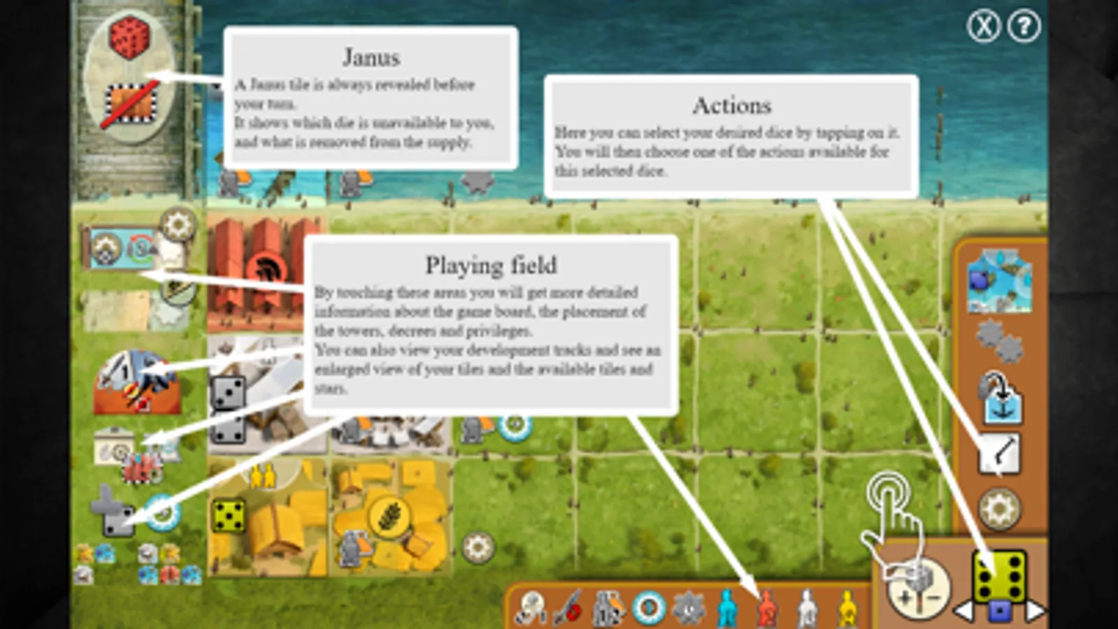 In 'Discordia', you develop your city by building farms, barracks, defenses, harbors, and markets, and by trading with ships. Use your seamen, soldiers, merchants, and farmers profitably, fulfill decrees, and secure privileges — acting carefully at all times so that your city grows neither too fast nor too slow. Will you have the best-developed city at the end of the fourth year and score many points, or will you manage to impress the empress before then and win the game early?