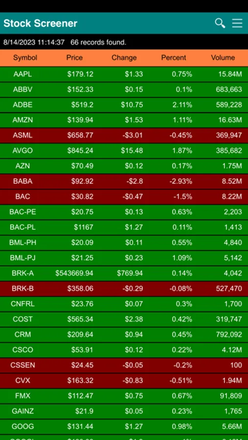 The app currently support over 6,000 stocks, ETFs and ADRs on the US markets. Intraday data for the screening are processed and refreshed every 2 - 3 minutes when markets open.